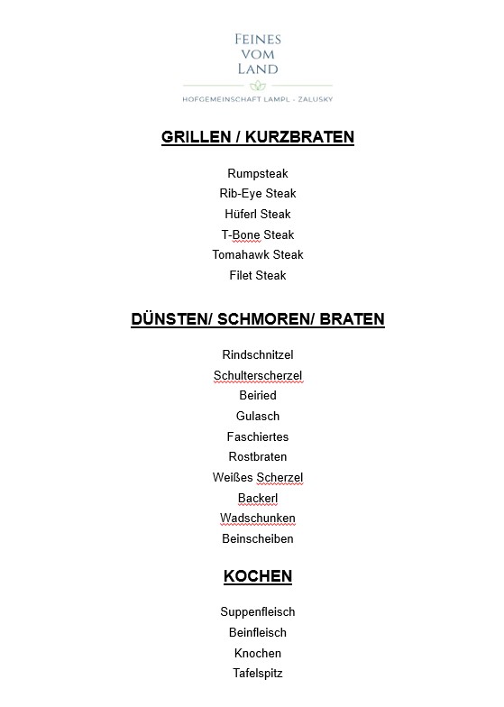 Unsere Preisliste senden wir Ihnen auf Wunsch gerne zu ! (bestellung(at)feinesvomland.at) oder telefonisch unter 06991/2177153